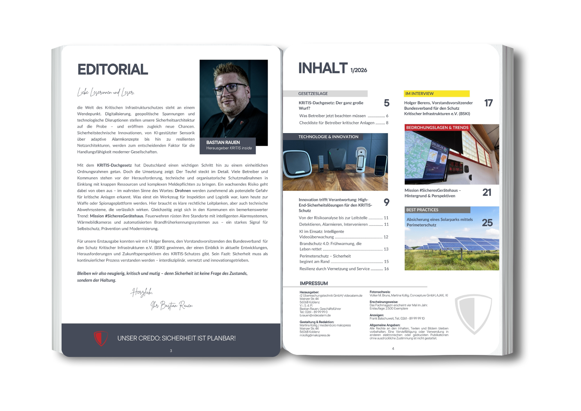 KRITIS inside ist das neue Fachmagazin für Kritischen Infrastrukturschutz, das mit Ausgabe 1/2026 vier Mal jährlich erscheint. In einer Zeit, in der Versorgungssicherheit, Krisenvorsorge und Resilienz zunehmend an Bedeutung gewinnen, bietet das Magazin eine fundierte und praxisnahe Informationsplattform.